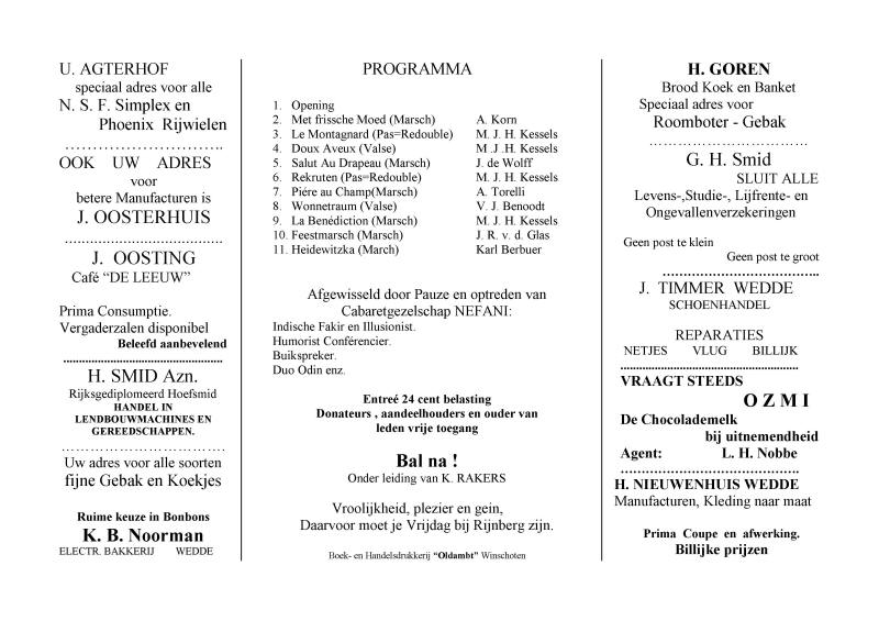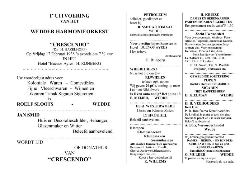 Eenige ingezeten van Wedde willen trachten om hier een muziekcorps op te richten, op neutrale basis, waarvoor reeds een commissie in het leven werd geroepen. Bedoelde commissie zou het op prijs stellen, om Maandag 25 Jan. a.s. ’ s avonds 7 ½ uur, een vergadering te beleggen in een der lokaliteiten der School alhier en nodigt U uit, op plaats en tijd voorschreven aanwezig te zijn, om met haar een en ander te bespreken. Kennissen die met dit doel mochten sympathiseren, wilt U wel verzoeken mede te komen